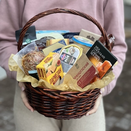 Состав: колбасные изделия 4 вида, сыр 5 вида, паштет 2 вида, шоколад 2 вида, корзина плетеная, упаковка. ОБРАЩАЕМ ВНИМАНИЕ! Возможно изменение состава в зависимости от поставок и сезонности, при этом характер композиции сохраняется
