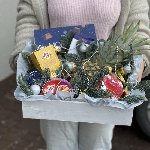 Состав: ананас, шоколад, конфеты 3 вида, чай, мед, сыр с белой плесенью, сыр с голубой плесенью, сыр плавленный, новогодний декор, нобилис (еловые лапки), деревянный ящик, упаковка. ОБРАЩАЕМ ВНИМАНИЕ! Возможно изменение состава в зависимости от поставок и сезонности, при этом характер композиции сохраняется
