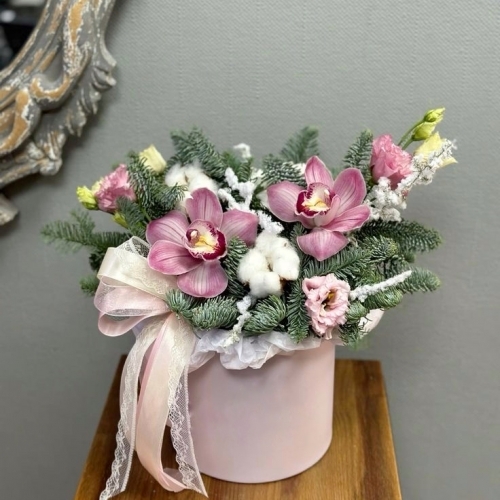 Состав: нобилис (еловые лапки), орхидея, эустома, новогодний декор, коробка